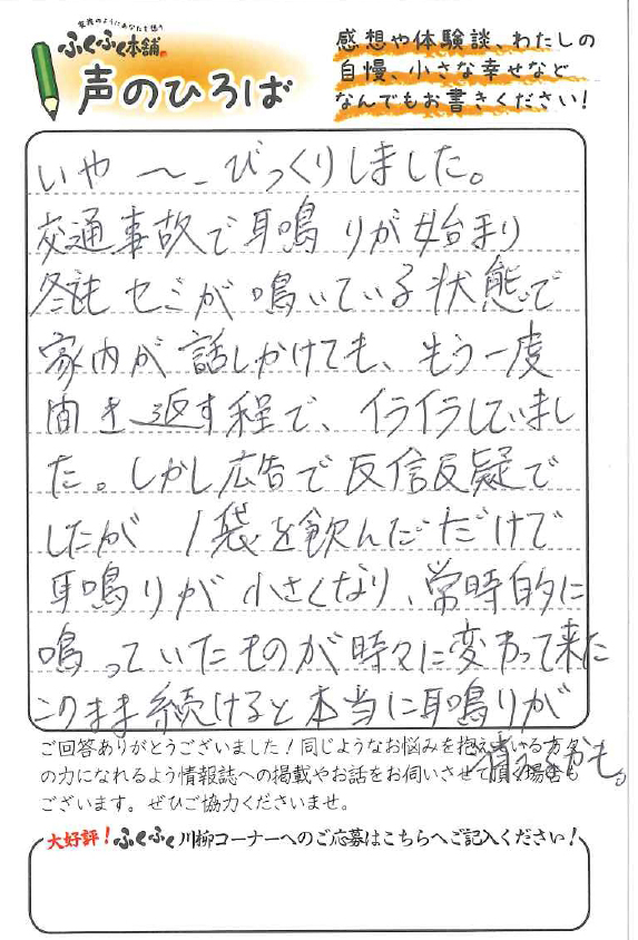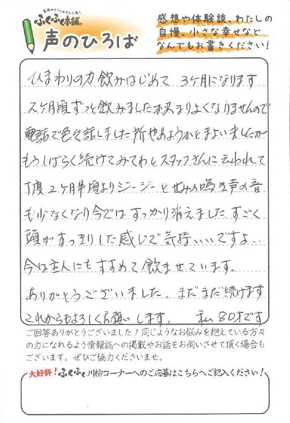 ふくふく本舗には、ひまわりの種皮エキスを主成分とした「きんいん」がございますが、こういった耳鳴りや難聴に悩まれる方から沢山の感謝のハガキを頂きます。